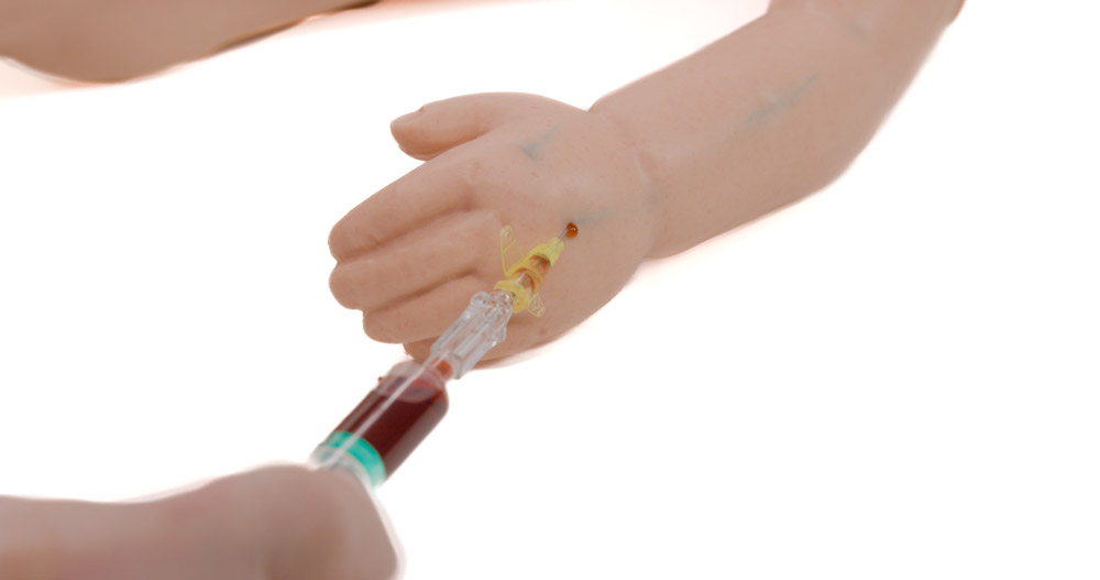 Simulador de brazo para entrenamiento en bloqueos nerviosos guiados por ecografía. Incluye venas y arterias simuladas, estructuras nerviosas visibles y respuesta realista a la aguja.